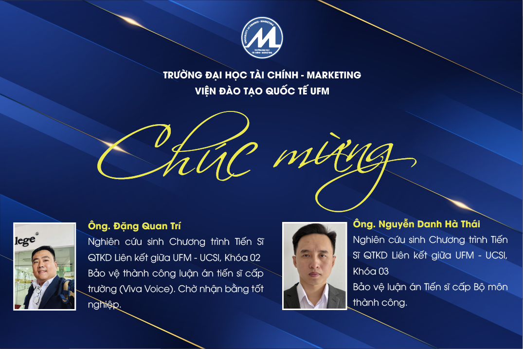 1. Ông Đặng Quan Trí, Nghiên cứu sinh Khóa 2 – Chương trình Tiến sĩ Quản trị Kinh doanh liên kết UFM – UCSI (Malaysia), đã bảo vệ thành công luận án Tiến sĩ cấp Trường (Viva Voce). Chờ nhận bằng Tiến sĩ.