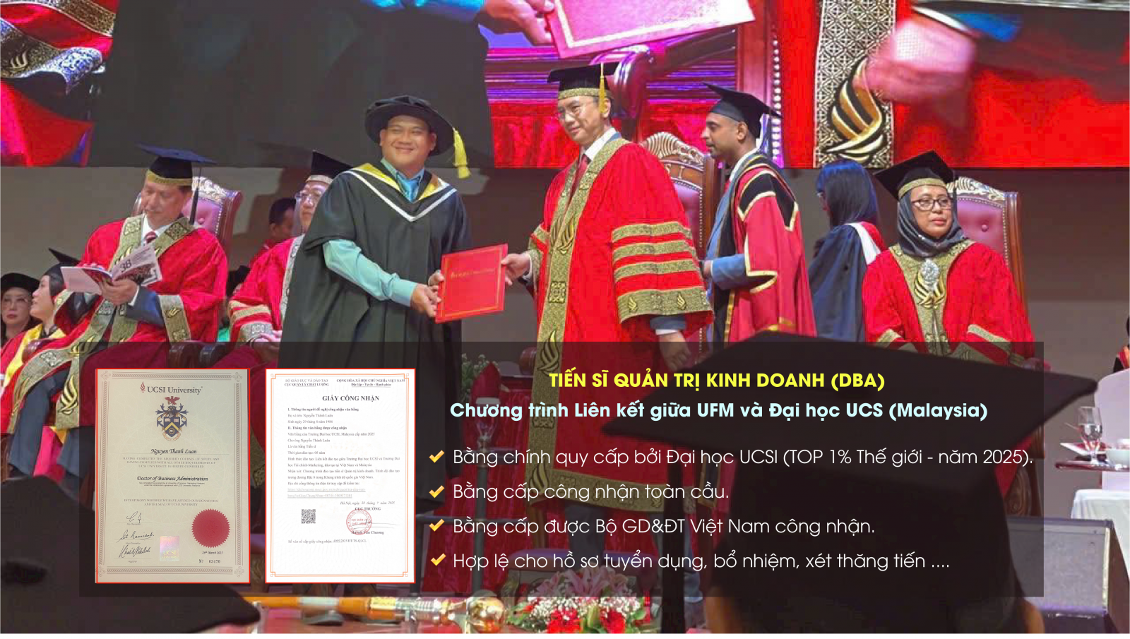 Trong hành trình hội nhập giáo dục toàn cầu, Trường Đại học Tài chính – Marketing (UFM) không ngừng tiên phong kiến tạo những chương trình đào tạo chuẩn quốc tế nhằm mở rộng cơ hội học thuật và phát triển nghề nghiệp cho đội ngũ giảng viên, chuyên gia và nhà quản lý tại Việt Nam. Một minh chứng tiêu biểu cho định hướng ấy chính là chương trình Tiến sĩ Quản trị kinh doanh (Doctor of Business Administration - DBA) liên kết giữa UFM và Đại học UCSI (Malaysia) – một trong những trường đại học uy tín hàng đầu khu vực Đông Nam Á.