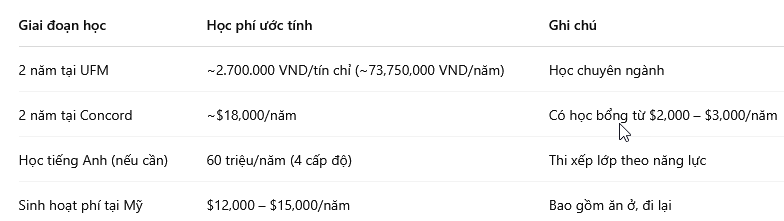 Sinh viên theo mô hình 2+2 sẽ học 2 năm tại UFM (Việt Nam) và 2 năm tại Concord (Hoa Kỳ), nhận bằng Cử nhân do Concord University cấp, có giá trị toàn cầu và được công nhận quốc tế.